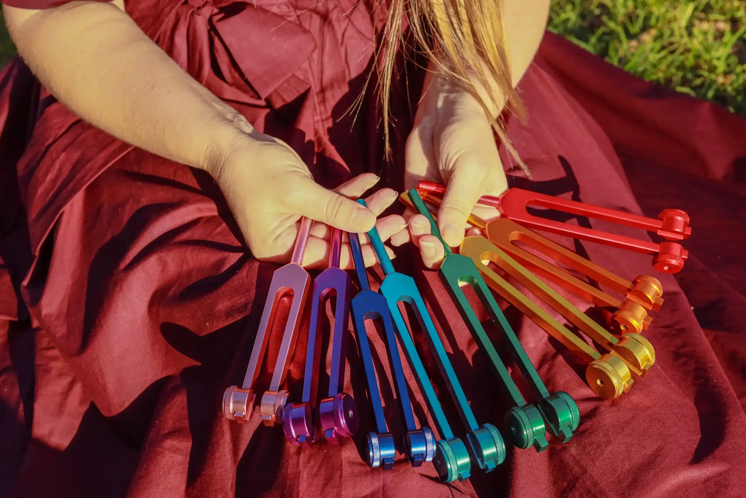 I use weighted chakra tuning forks with a stem at the base. When the fork is activated, the stem is gently placed on specific acupressure points on your body. This allows the unique quality of the frequency to meet the unique quality of the point, supporting the movement of energy through vibration. The tuning forks are also used off the body, working within the layers of your aura to support energetic balance.